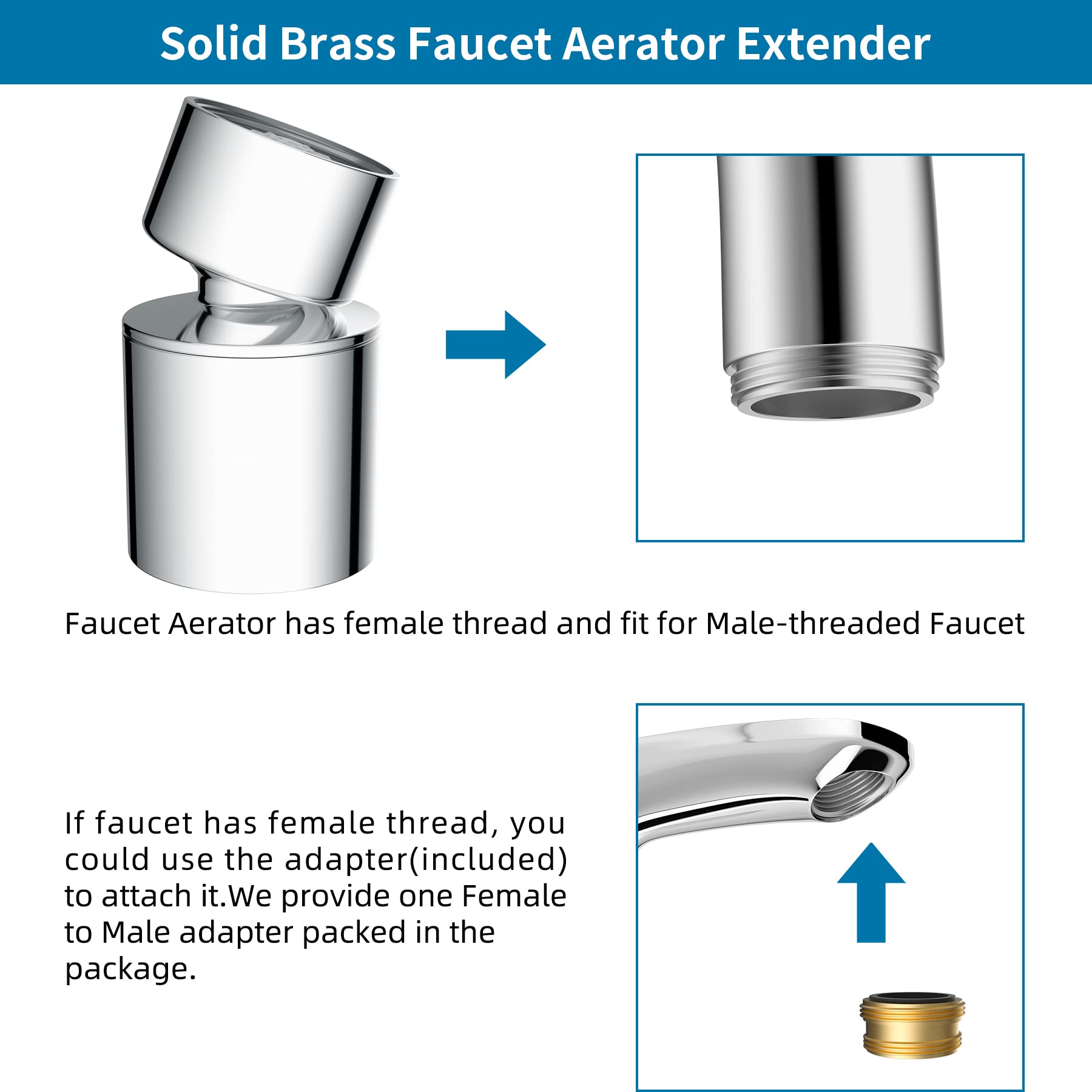 Helppo asentaa: Keittiöhanan jatkokappaleessa on sisäkierre, joka sopii hanoihin, joissa on ulkokierre. Jos hanasi kierre on sisäkierre, voit valita siihen sopivan sovittimen. Toimitamme pakkauksessa adapterin naaras- ja uroskierteestä.
