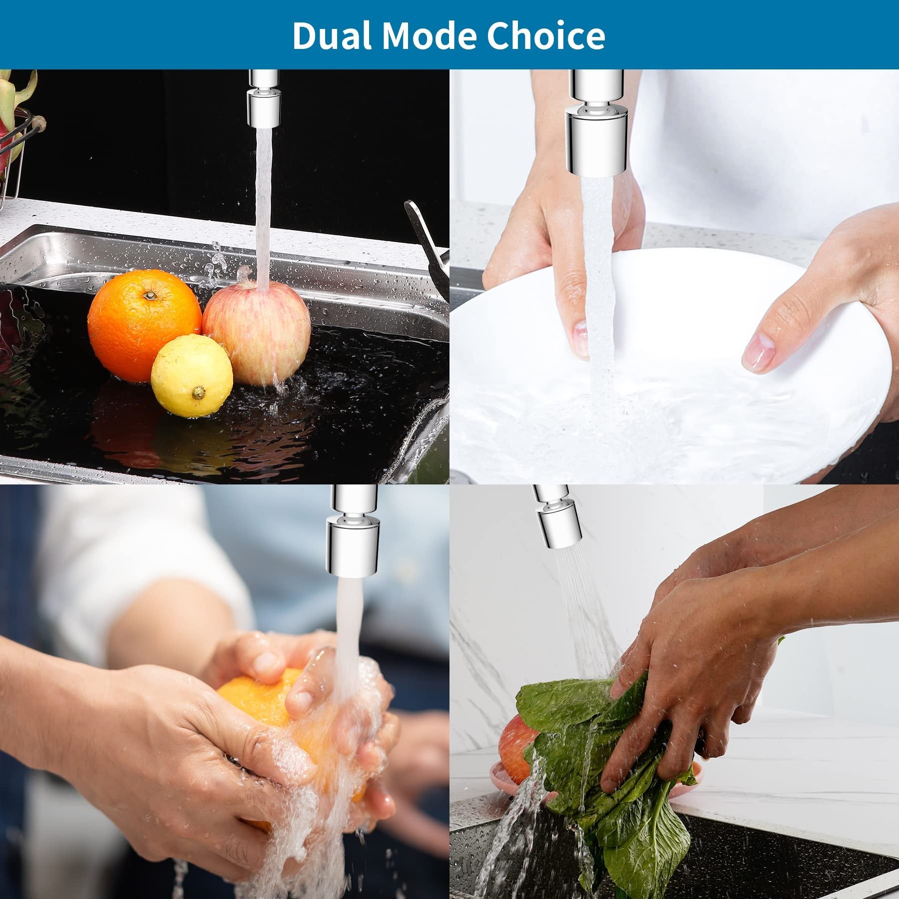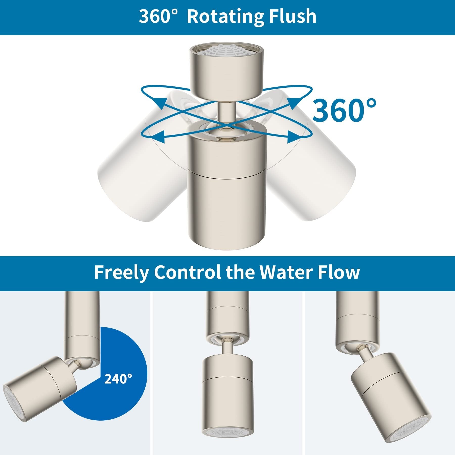 2-suihkusuutin, jossa on kaksi toimintoa: Keittiöhanan ilmastin on 100-prosenttisen tiivis, ja pyörivä pohja voi muuntaa lempeän kuplavirran tehokkaaksi suihkuksi 360 asteen pyörimisellä.