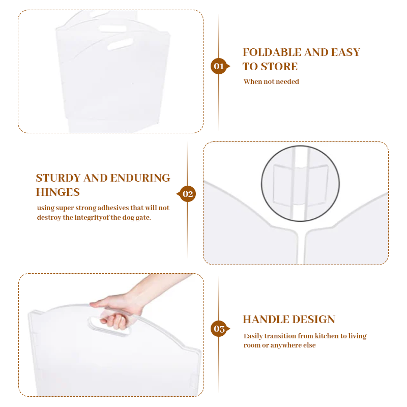 Pidä lemmikkisi turvassa ja kotisi tyylikkäänä innovatiivisella kirkkaalla akryylisellä lemmikkiportillamme! Toisin kuin perinteiset metalli- tai puuportit, tämä kolmipaneelinen taittuva muotoilu tarjoaa täyden näkyvyyden ja luo samalla turvallisen esteen oviaukkoihin, portaisiin ja käytäville. Täydellinen lemmikkien omistajille, jotka haluavat toimivuutta tinkimättä estetiikasta!
