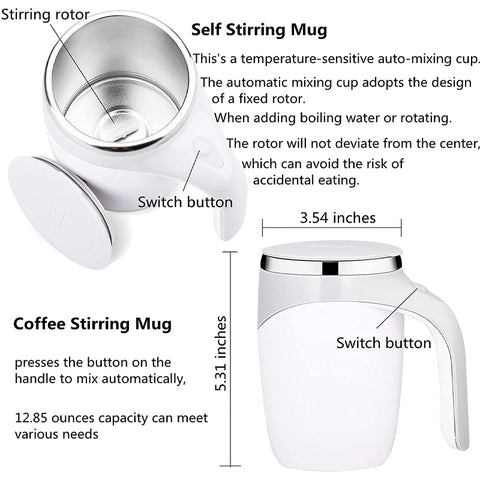 - Itsestään sekoittava kuppi: Kaksoisnapsauta kytkintä automaattisesti sekoittaaksesi. Täydellinen kahvin, maidon, kuuman suklaan, proteiinijauheen, teen, kaakaon, mehun, pelletin, ruskean sokeriveden, pirtelöiden, limonadin ja monien muiden miedosti sekoitettavien juomien sekoittamiseen, joita voidaan sekoittaa.