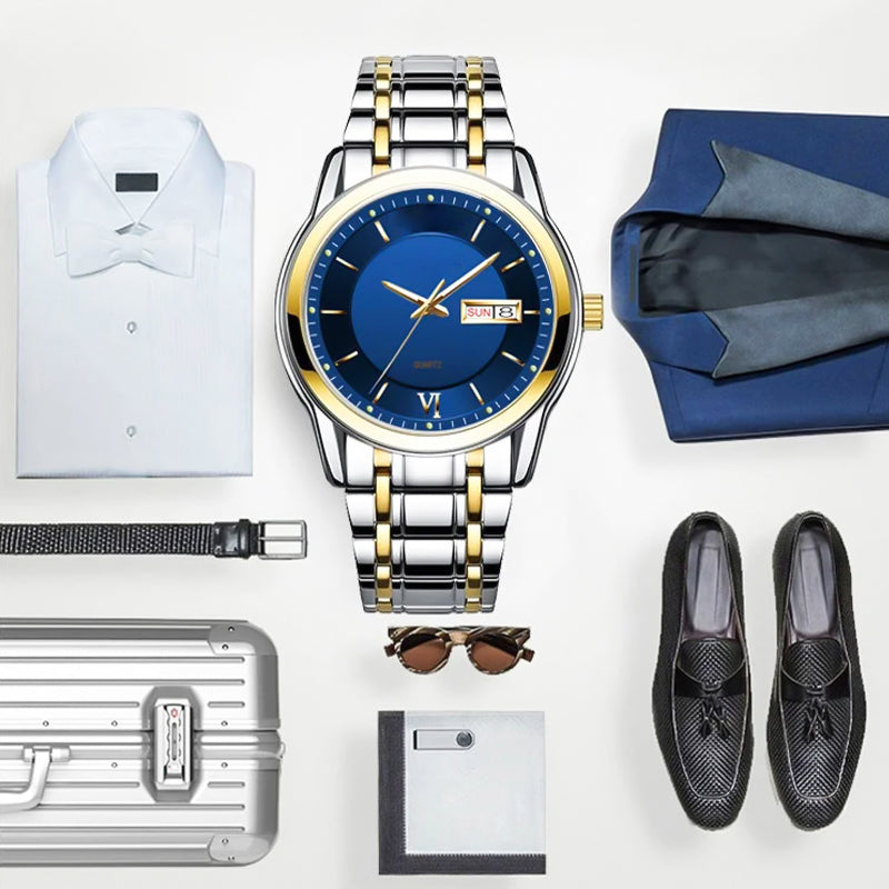 - 1 x Erittäin ohut, vedenpitävä miesten kvartsikello, jossa on kaksinkertainen kalenteri-ikkuna